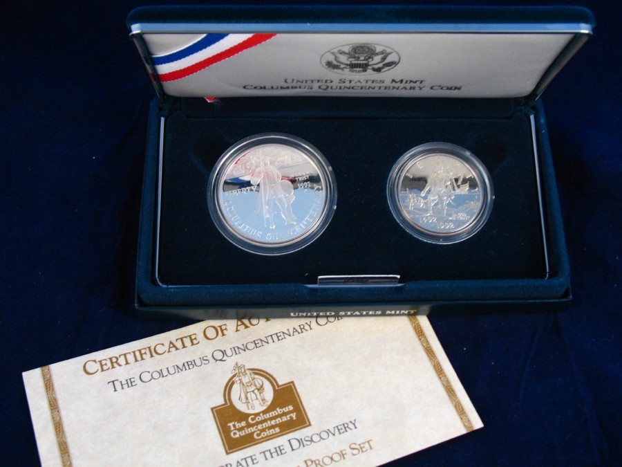 1992 Columbus Quincentenary Silver Dollar Proof and Clad Half Dollar Set, issued to commemorate the 500th anniversary of Christopher Columbus discovery of America.