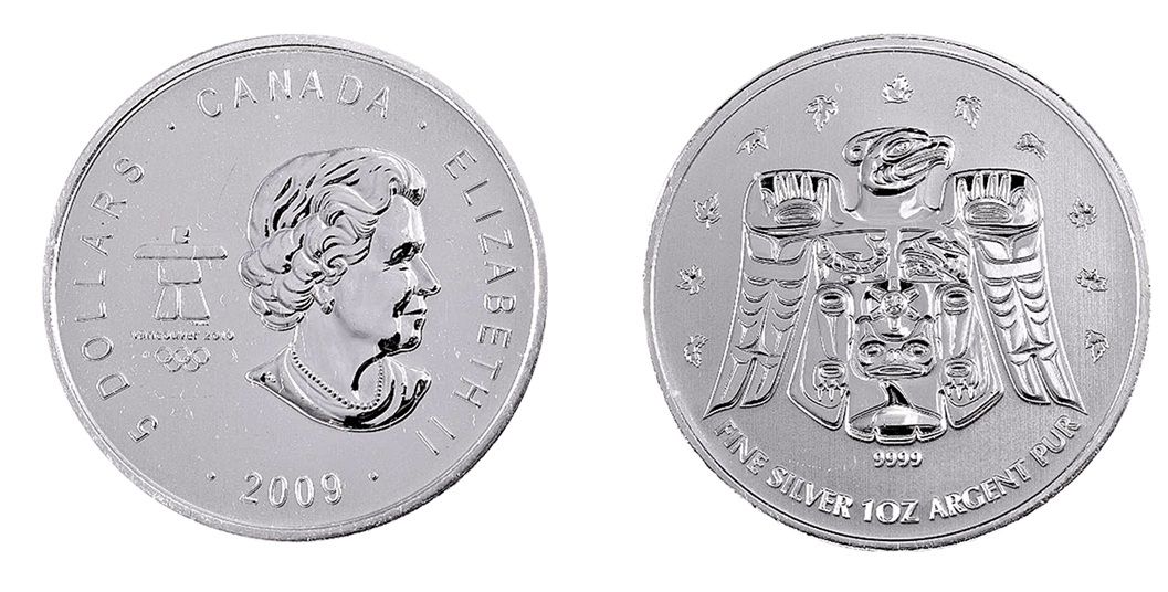 The coin features a Native American Thunderbird totem, cleverly formed to approximate the shape of a Canadian maple leaf on the reverse, and Queen Elizabeth II on the obverse.