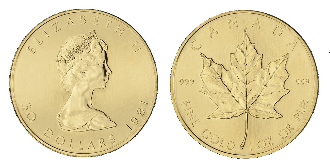 1979-1982 Canadian Gold Maple Leaf 1 Troy oz 24 karat (.999 fine) legal tender coin struck by the Royal Canadian Mint. The Gold Maple carries a face value of Canadian $50, and was first introduced in 1979. At that time it was the first pure gold bullion coin available for investors.