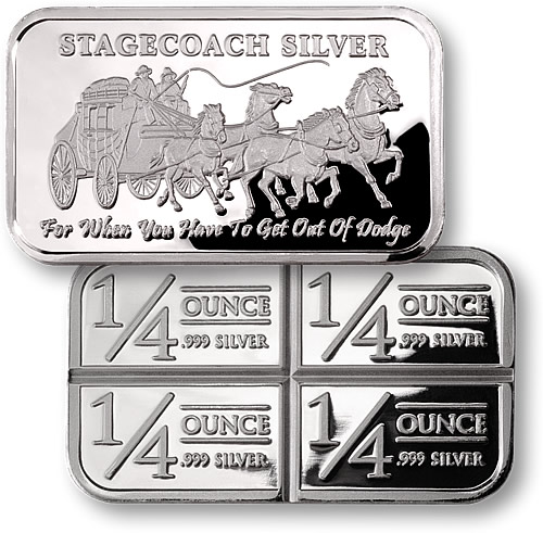 Stagecoach silver bars are an interesting silver bullion barter product marketed to the survivalist worried about TEOTWAWKI. Each bar has score lines on the reverse that allow you to divide the bars into 4 equal sized parts weighing 1/4 troy oz each, giving you a smaller barter silver bar if the need arises.
